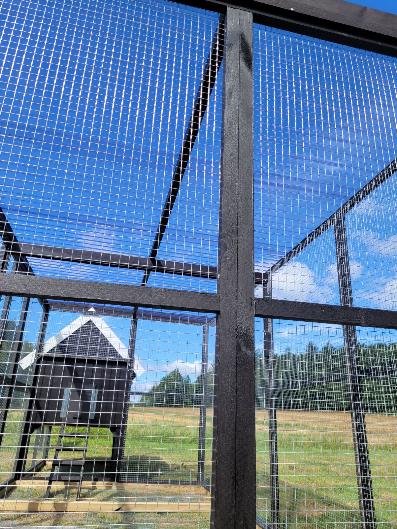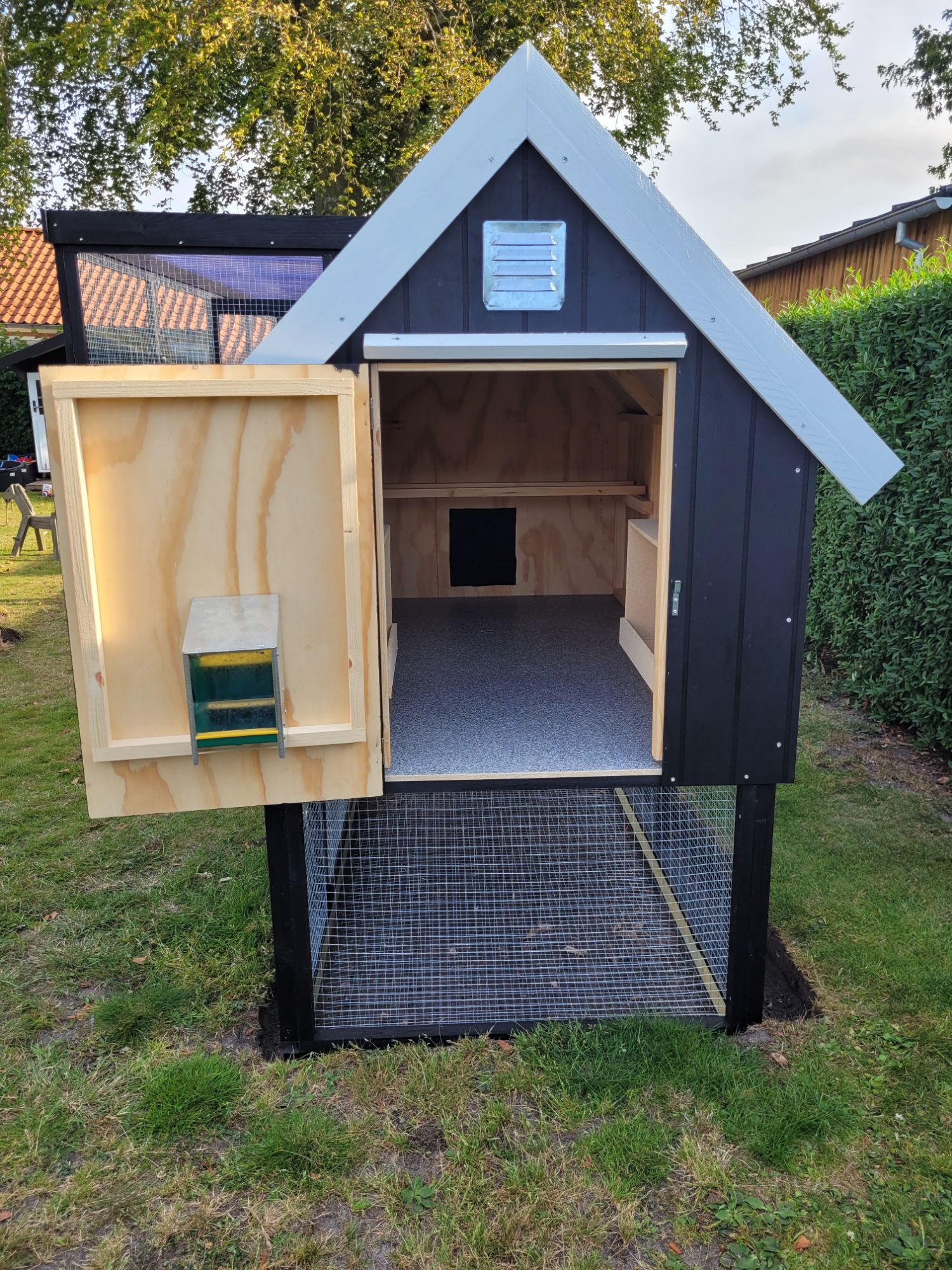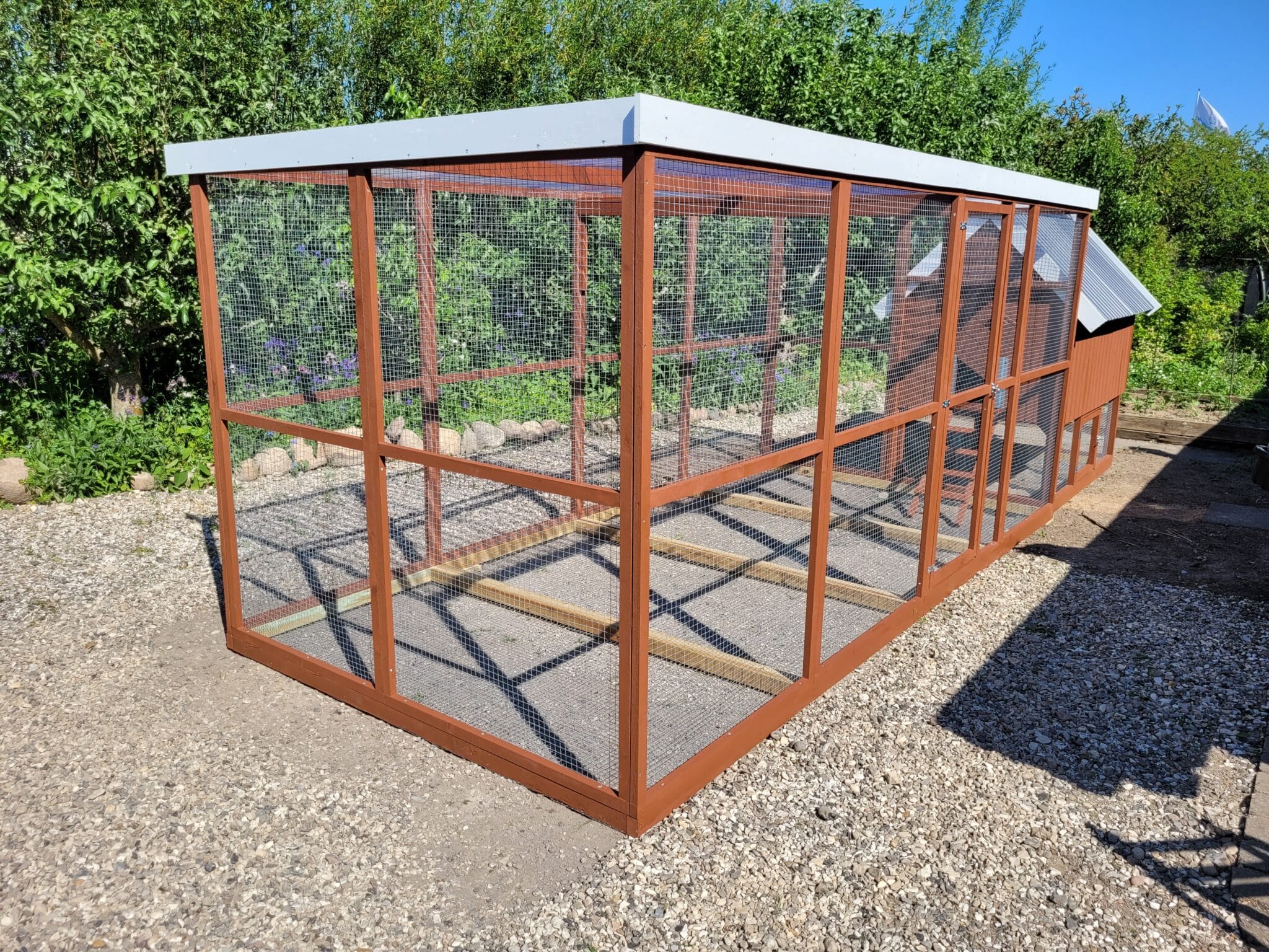 Hønsehus opbygget af 9 mm sporplade, alm lægter, osb plade, og pvc som tag.