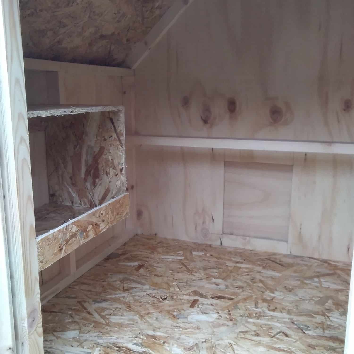 Hønsehus opbygget af 9 mm sporplade, alm lægter, osb plade, og pvc som tag.