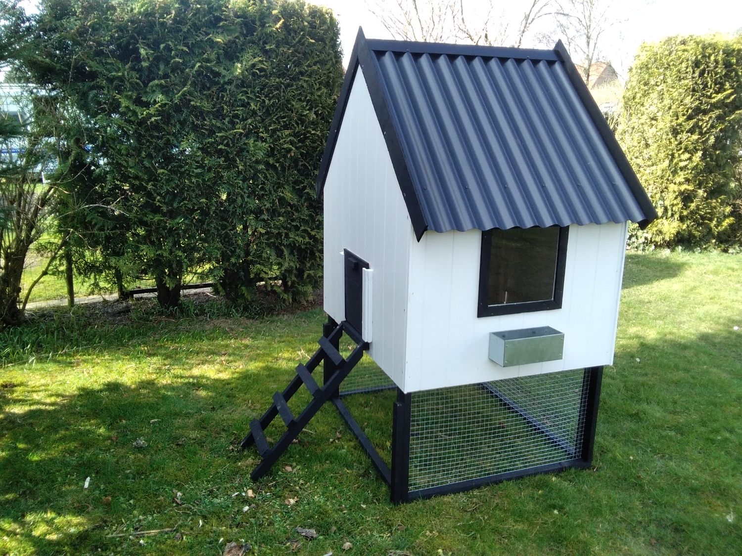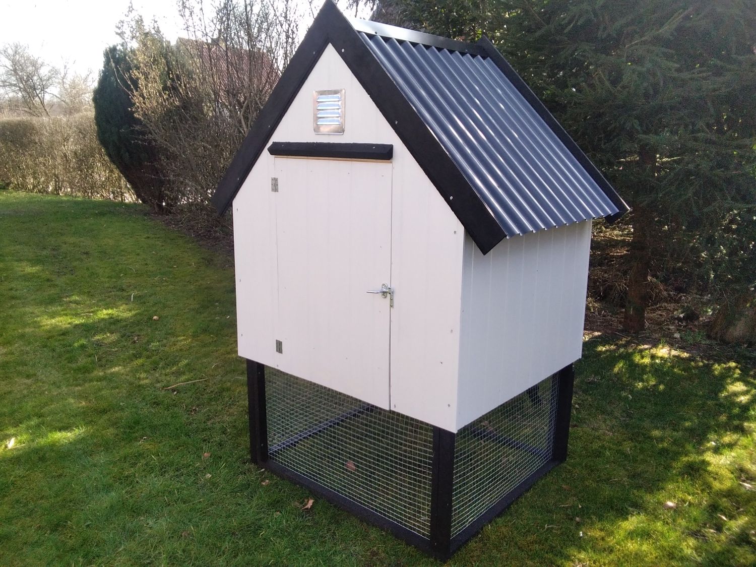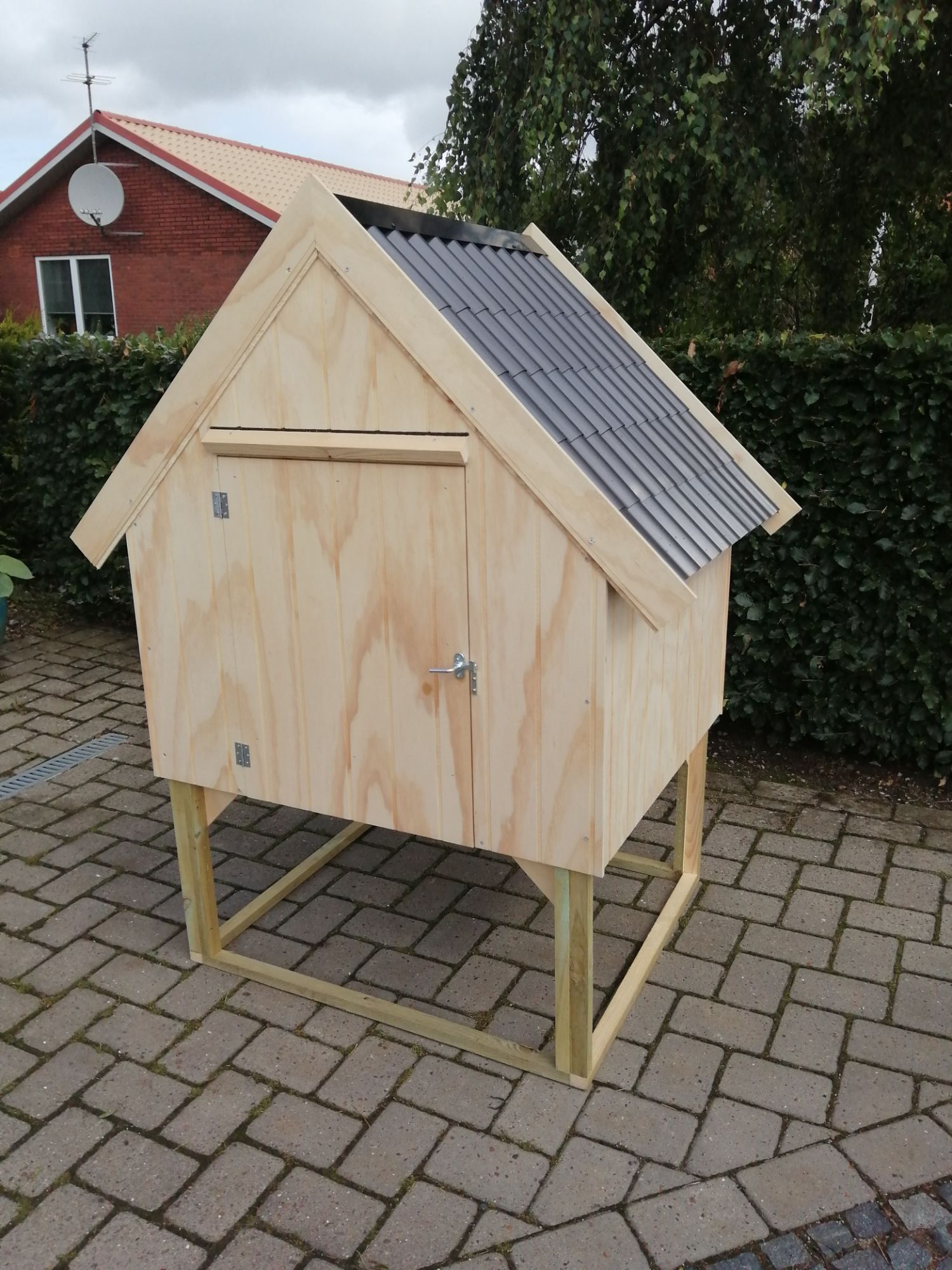 Huset er lavet af 9 mm sporplade, og 10 mm krydsfiner plade, med pvc tag.