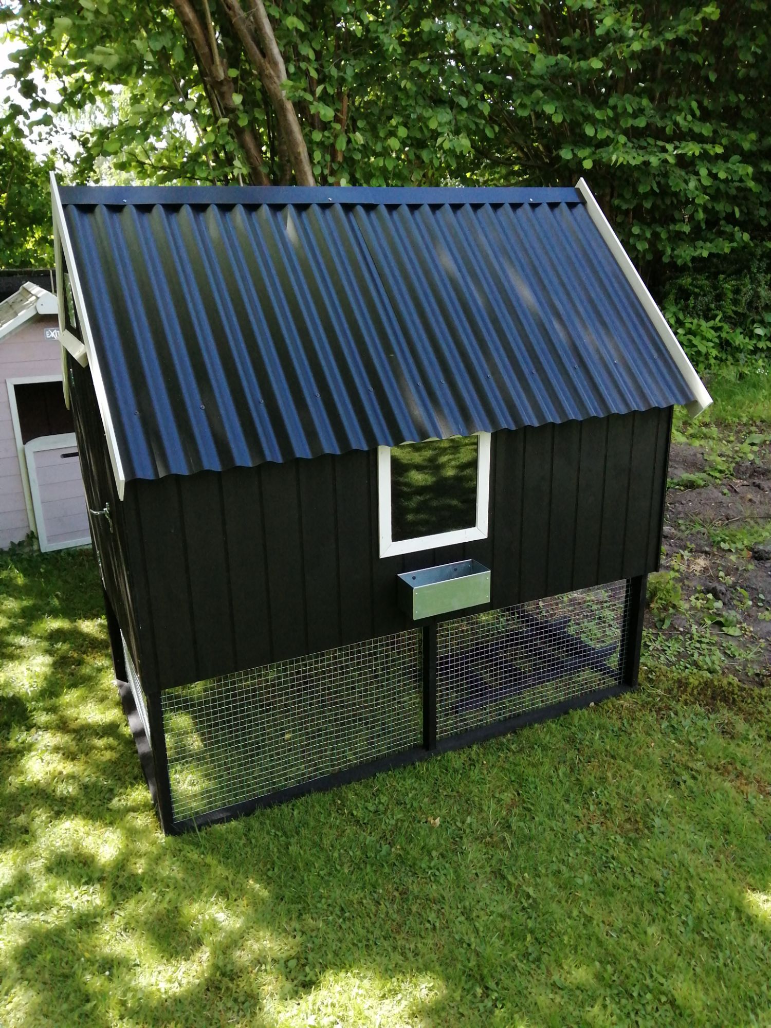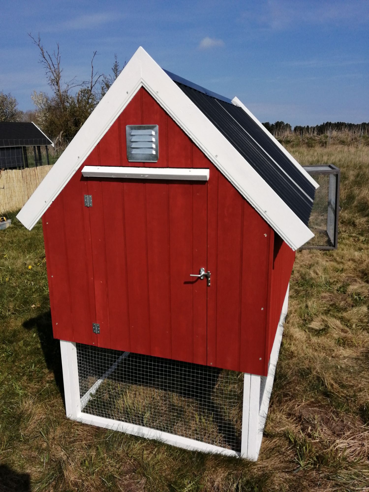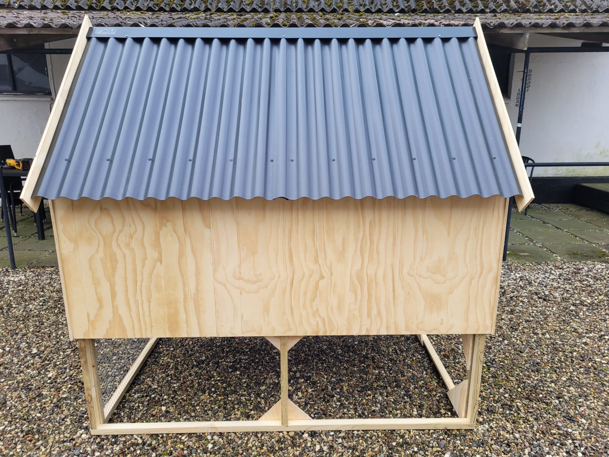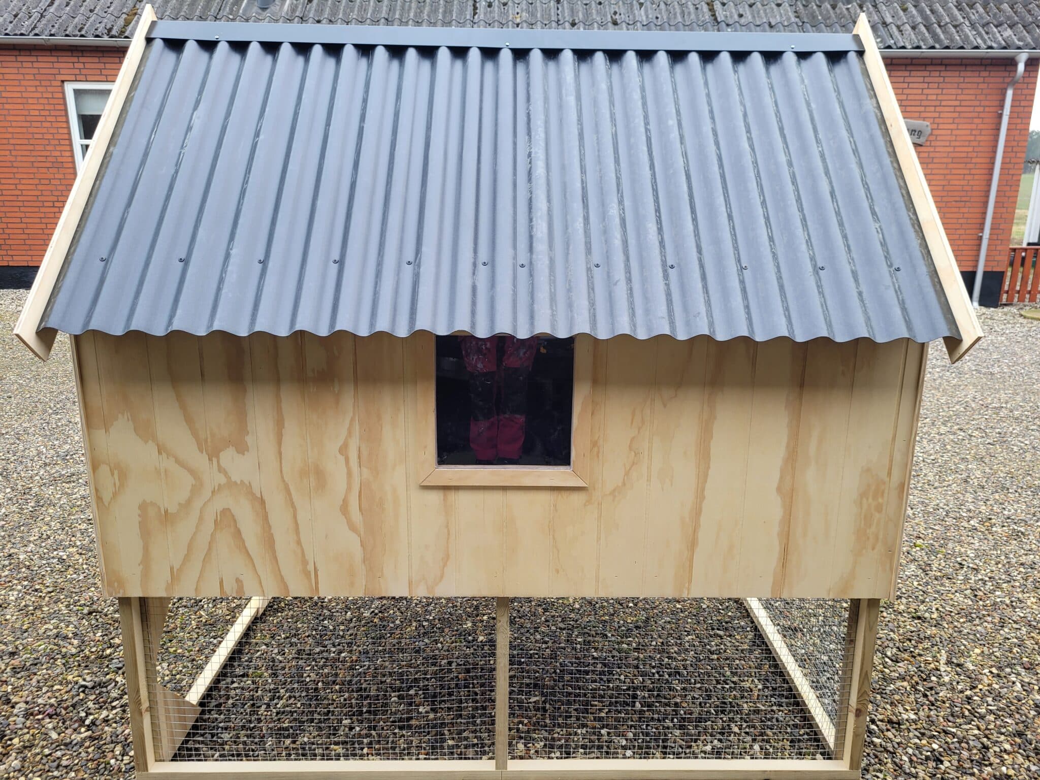 Hønsehus opbygget af 9 mm sporplade, alm lægter, osb plade, og pvc som tag.